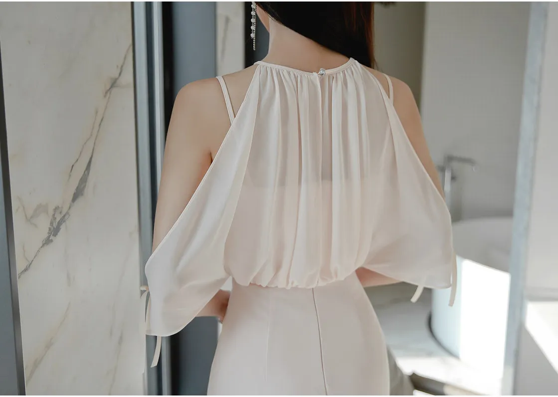 Chiffon splicing fake two-piece set, shoulder-slipping splicing waist and thin hip skirt
